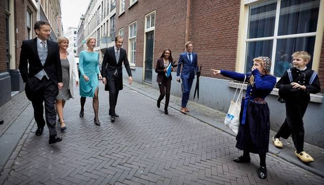 -Toevallige ontmoeting van minister Jeroen Dijsselbloem en staatssecretaris Eric Wiebes en echtgenotes op Prinsjesdag op straat met twee jongeren in klederdracht (Martijn Beekman).