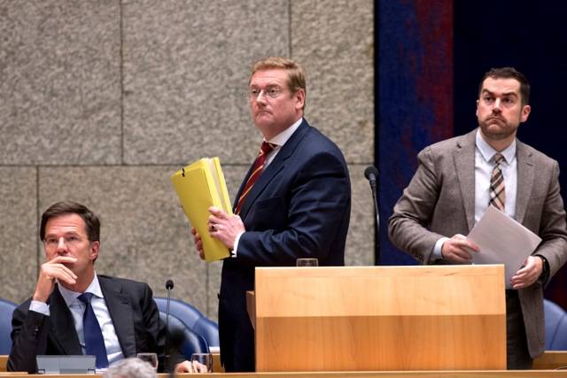 -Premier Mark Rutte, minister Ard van der Steur en staatssecretaris Klaas Dijkhoff kijken tijdens een debat verrast op naar de publieke tribune (Dirk Hol)
