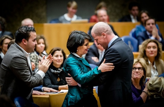 -PvdA-leider Diederik Samsom feliciteert de nieuwe Tweede Kamervoorzitter en partijgenote Khadija Arib, direct na haar verkiezing (Bart Maat)