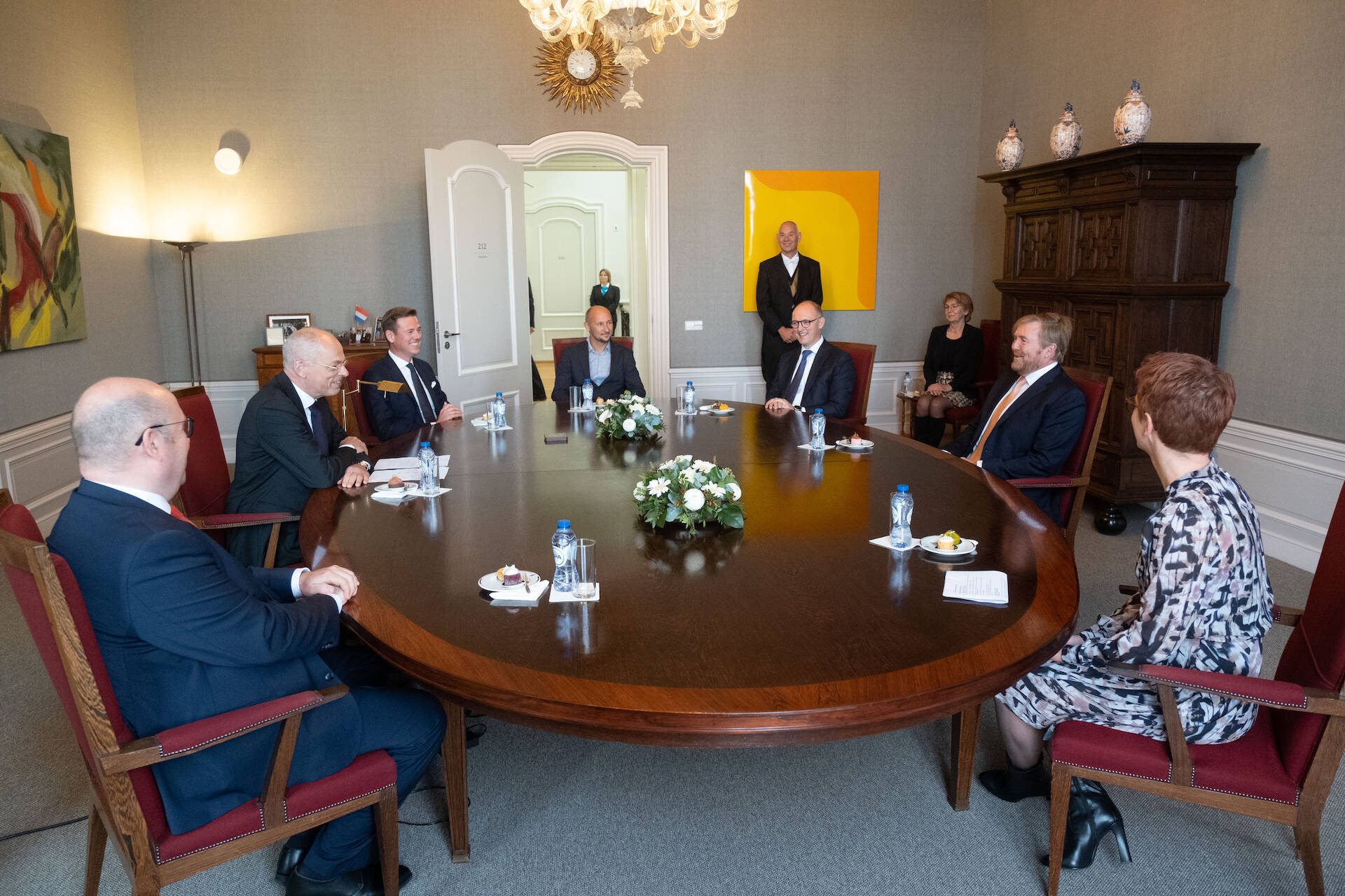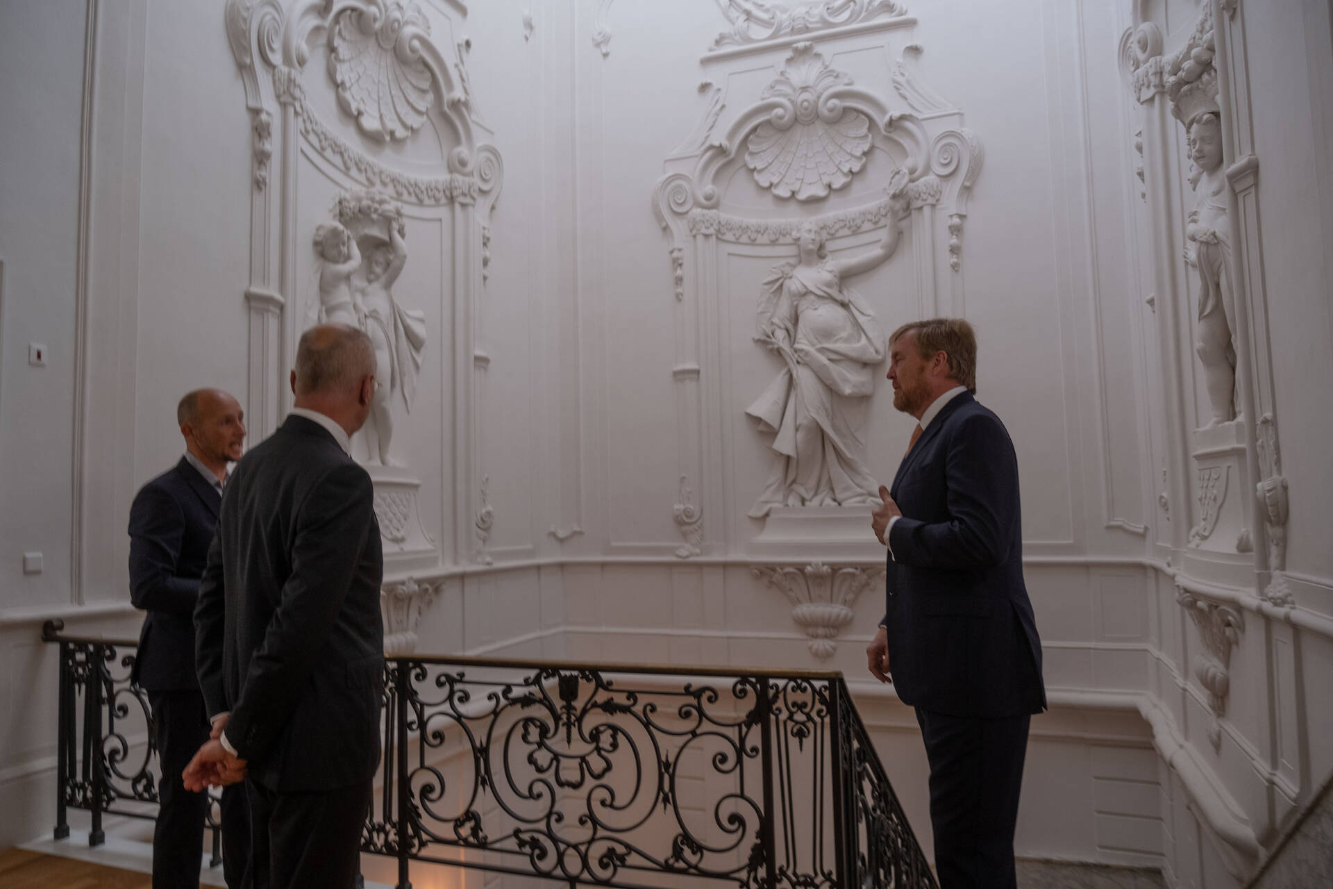 De Voorzitter van de Eerste Kamer, Jan Anthonie Bruijn, vertelde de Koning over de verhuizing en over het doorgaan van het parlementaire werk op een andere plek. Tijdens een rondleiding sprak de Koning met de restauratiearchitect, de kunstcoördinator en de projectleider huisvesting. Er is gesproken over de historie van het pand, de uitgangspunten en uitdagingen van de tijdelijke huisvesting, over kunst in de plenaire zaal en in andere ruimten en over de faciliteiten voor bijvoorbeeld livestreams van de vergaderingen.
